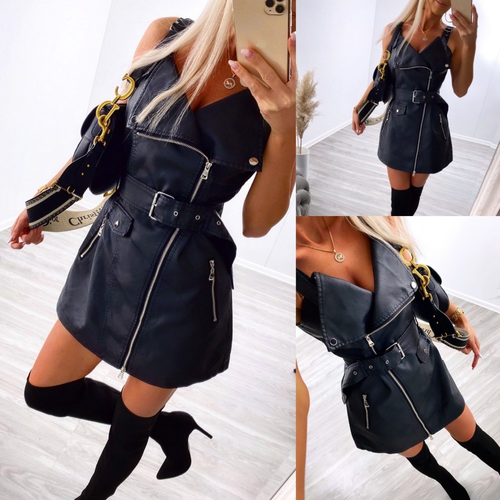 Vööga nahkne kleit (L, Must)