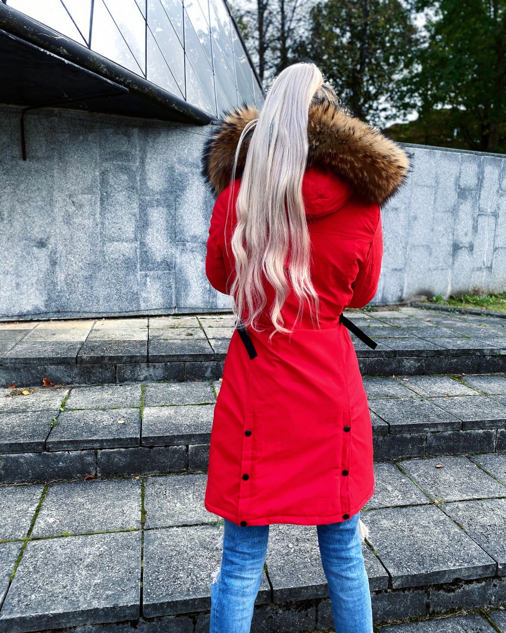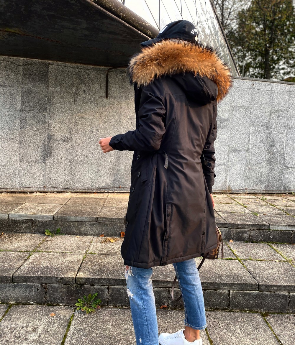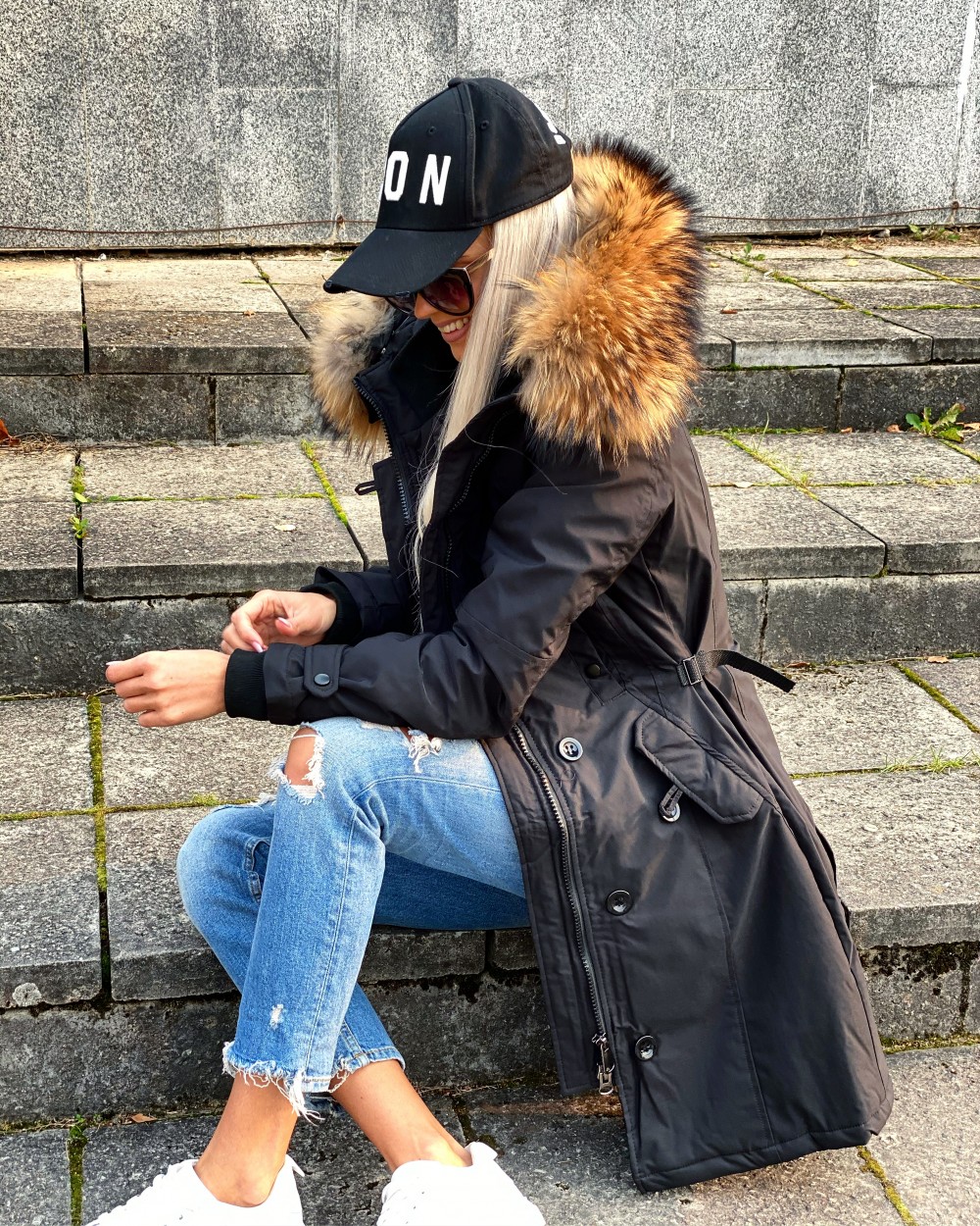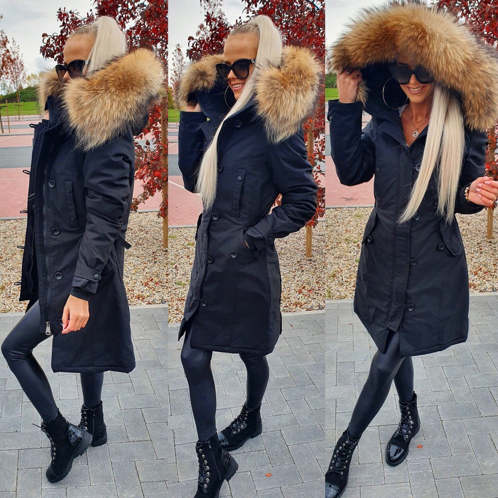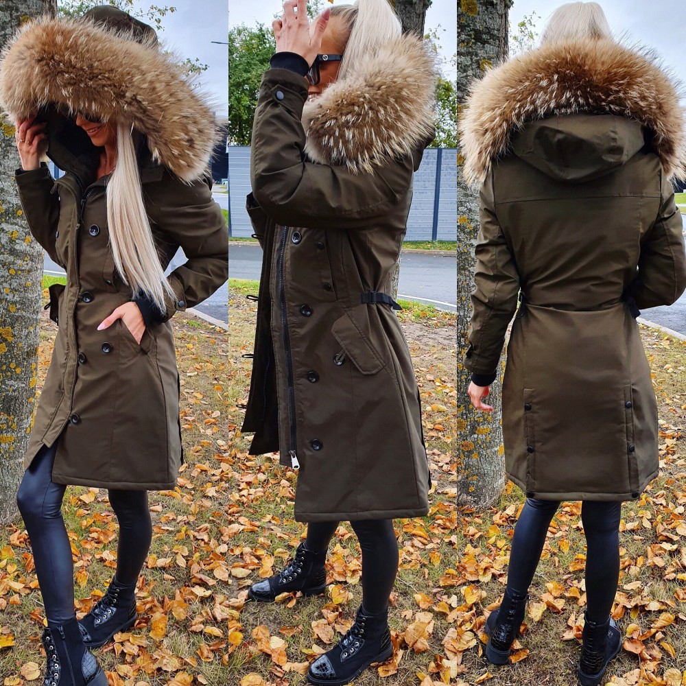 Naturaalse karvaga vetthülgav pikem talveparka (M, Khaki)