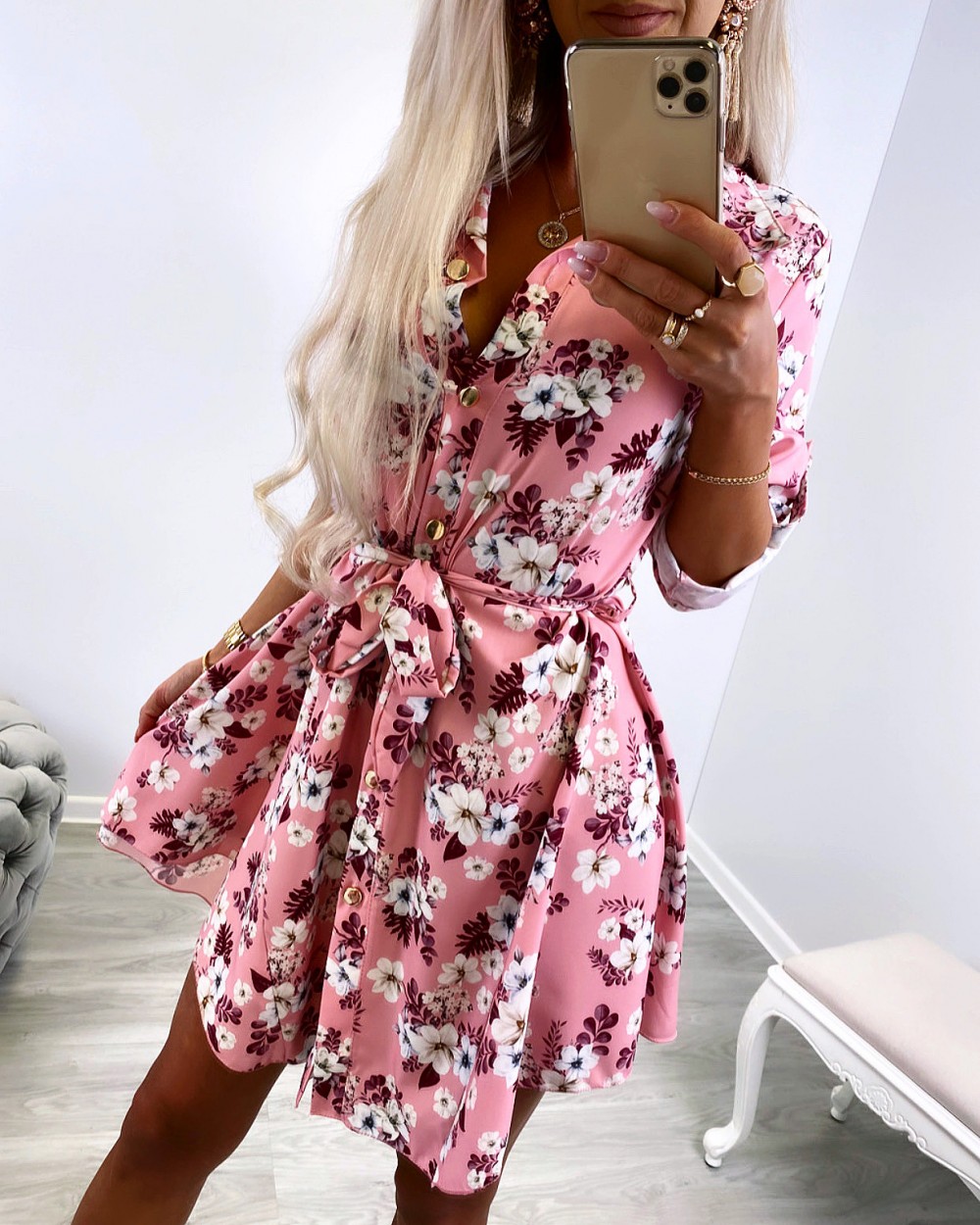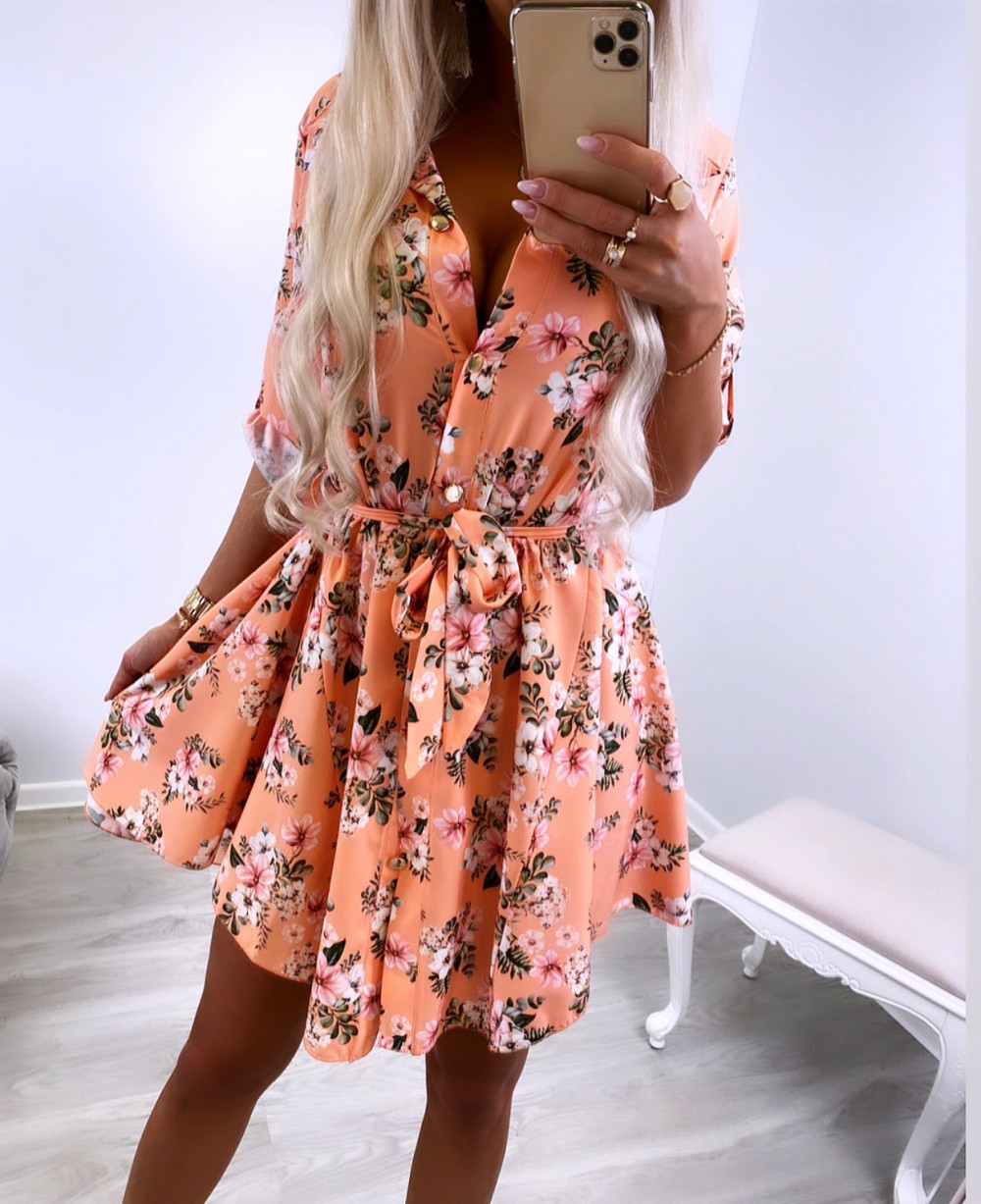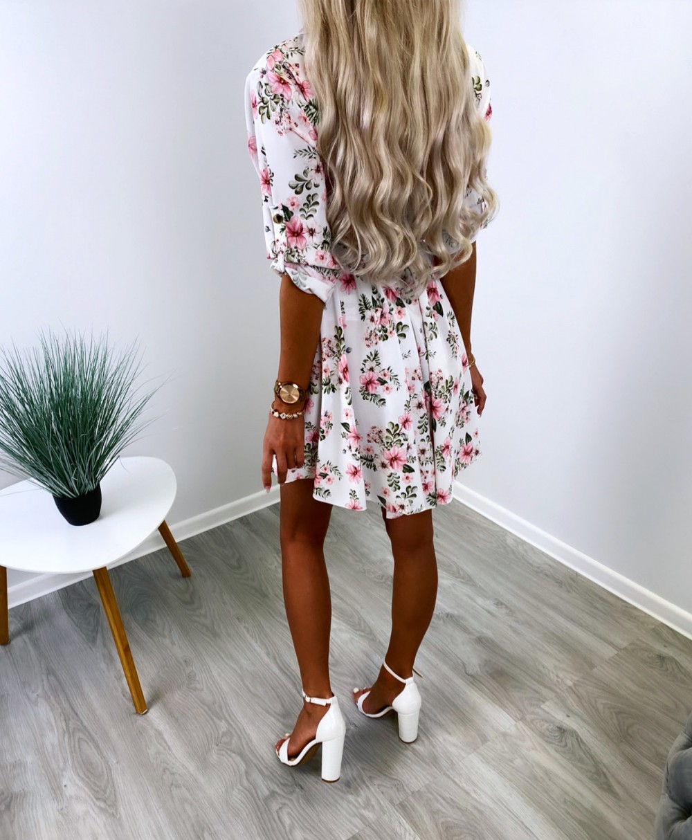 Gėlėta suknelė su diržu (Vienas dydis, Balta)