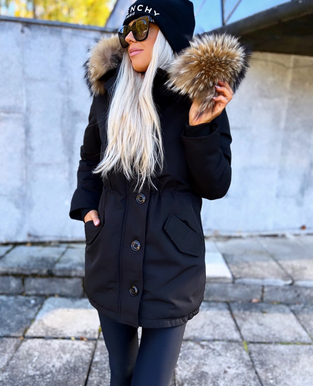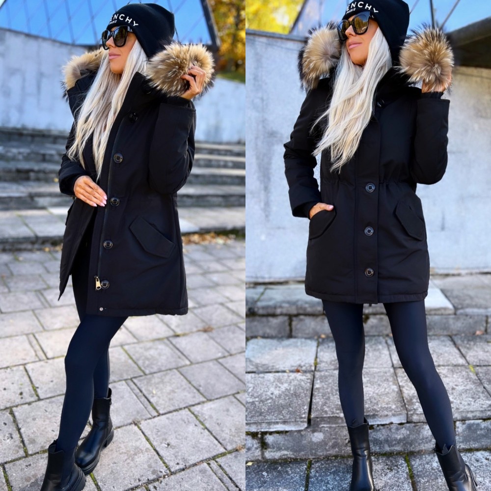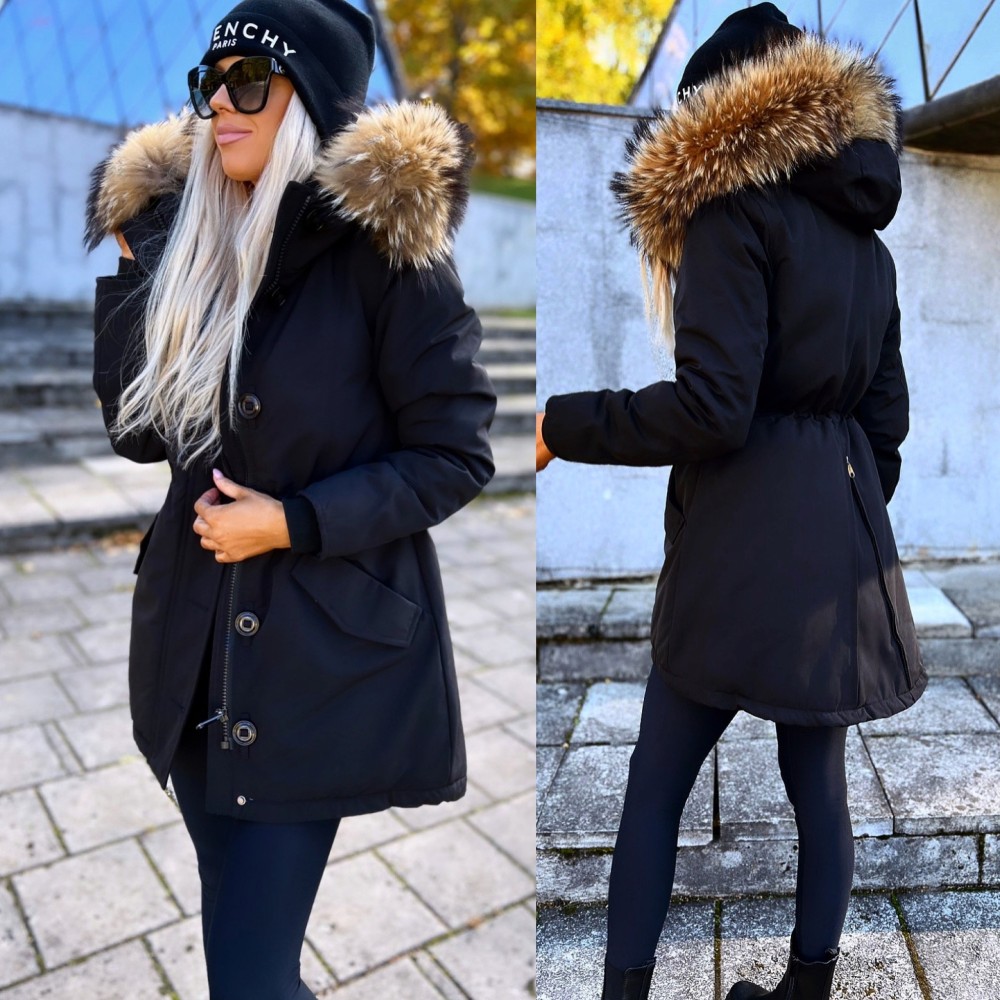 Ziemas jaka ar dabīgu kažokādu un garāku aizmugurējo daļu (L, Melns)